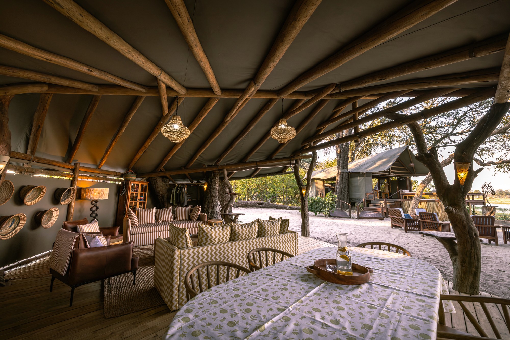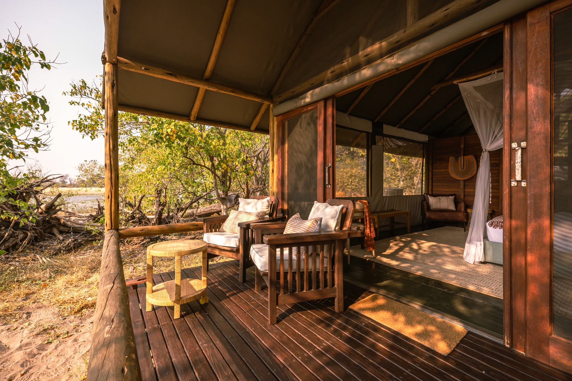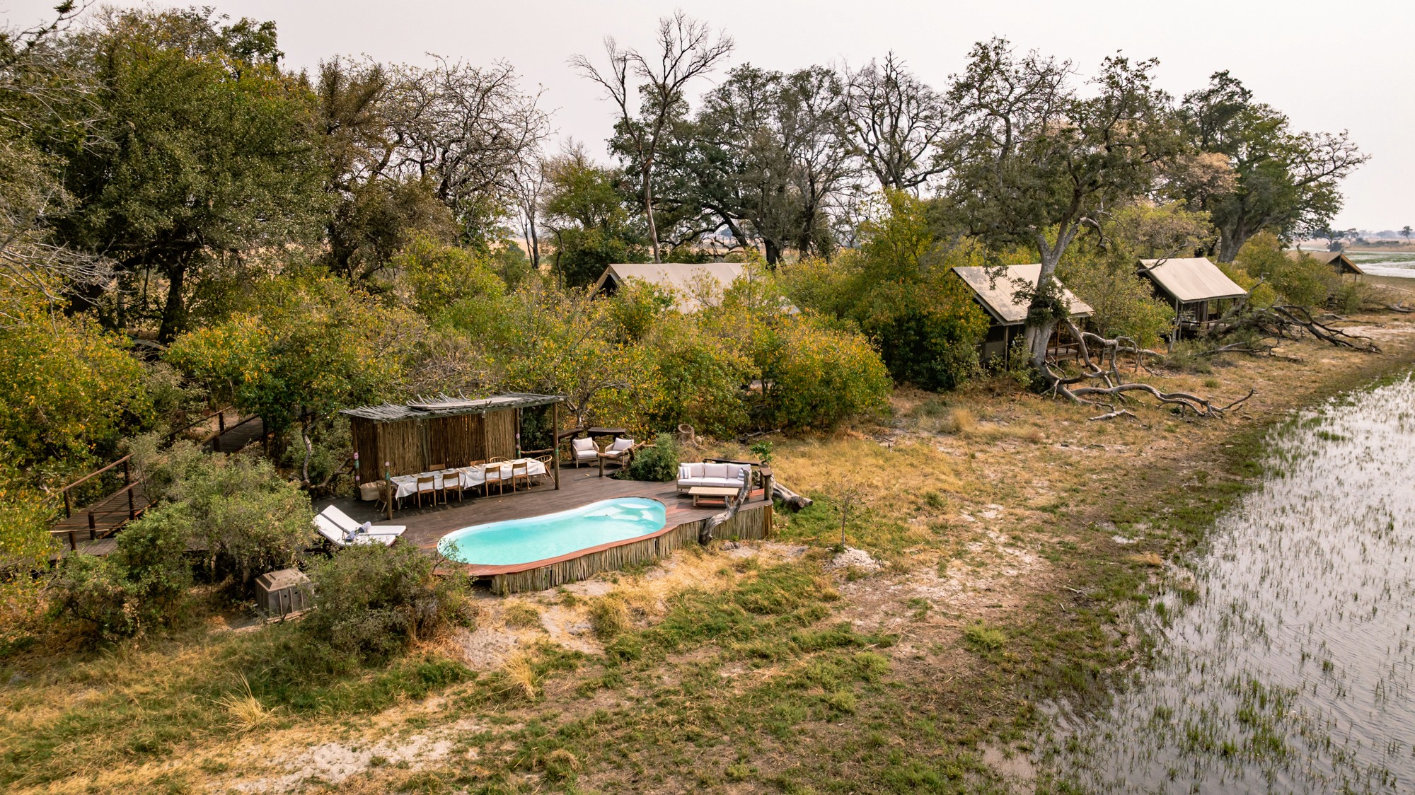 Boendet under safarin är huvudsakligen förlagt till Kujwana Camp, ett exklusivt tältcamp vackert belägen vid Xudumfloden. Här kombineras äkta bushkänsla med hög komfort – gästerna bor i rymliga tält med eget badrum, och kan njuta av pool, trädäck och wifi. Utsikten över flodslätten bjuder ofta på vilda djur av alla dess slag som passerar förbi, vilket gör att du ständigt är omgiven av naturen. På begäran kan man för ett pristillägg även boka de två rymliga Riverside Suites – Hippo Cradle eller Rocking Horse – med spektakulär utsikt över floden. På safarit erbjuds även boende ett så kallat fly camp (läs mer längre ned), för en mer avskild vildmarksupplevelse.