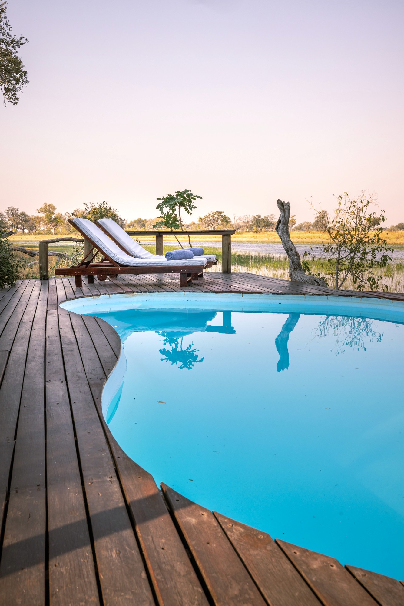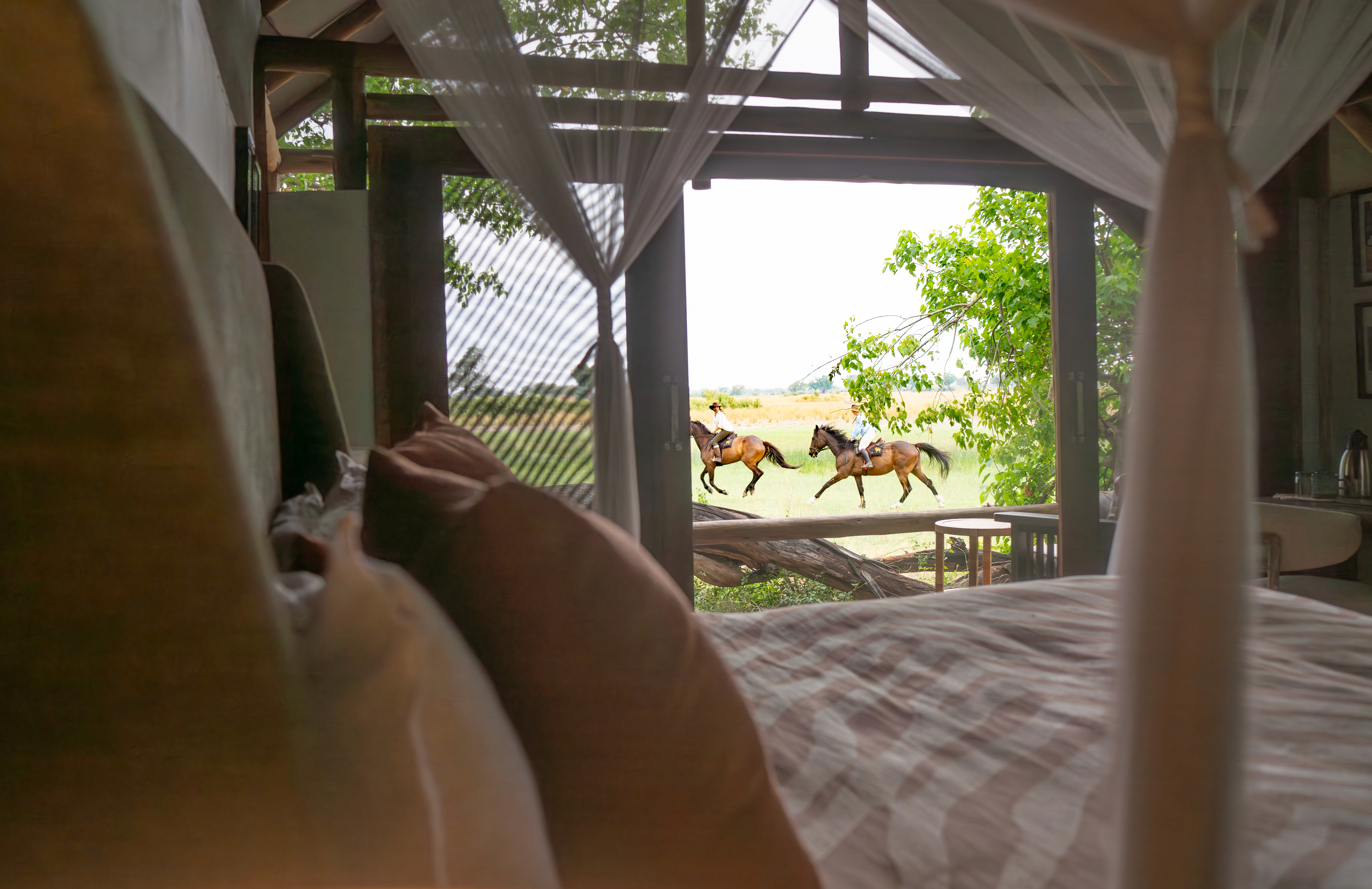 Ni väcks tidigt på morgonen med te eller kaffe som serveras vid tältet, att njuta av medan ni lyssnar på bushens ljud. Efter frukost väntar en morgonritt i Xudum-området, där ni rider genom frodiga gröna våtmarker (molapos) som leder er mellan öar. Här kan ni överraska en skygg reedbuck i tät vegetation eller uppleva hjordar av elefanter, bufflar och zebror som rör sig över de öppna slätterna. Åter till camp för lunch, följt av siesta eller ett dopp i poolen. På eftermiddagen ges ni er ut på en stillsam mokorotur längs floden och upplever deltats lugn från traditionella kanoter. Njut av färgerna när solen sakta går ner över horisonten.