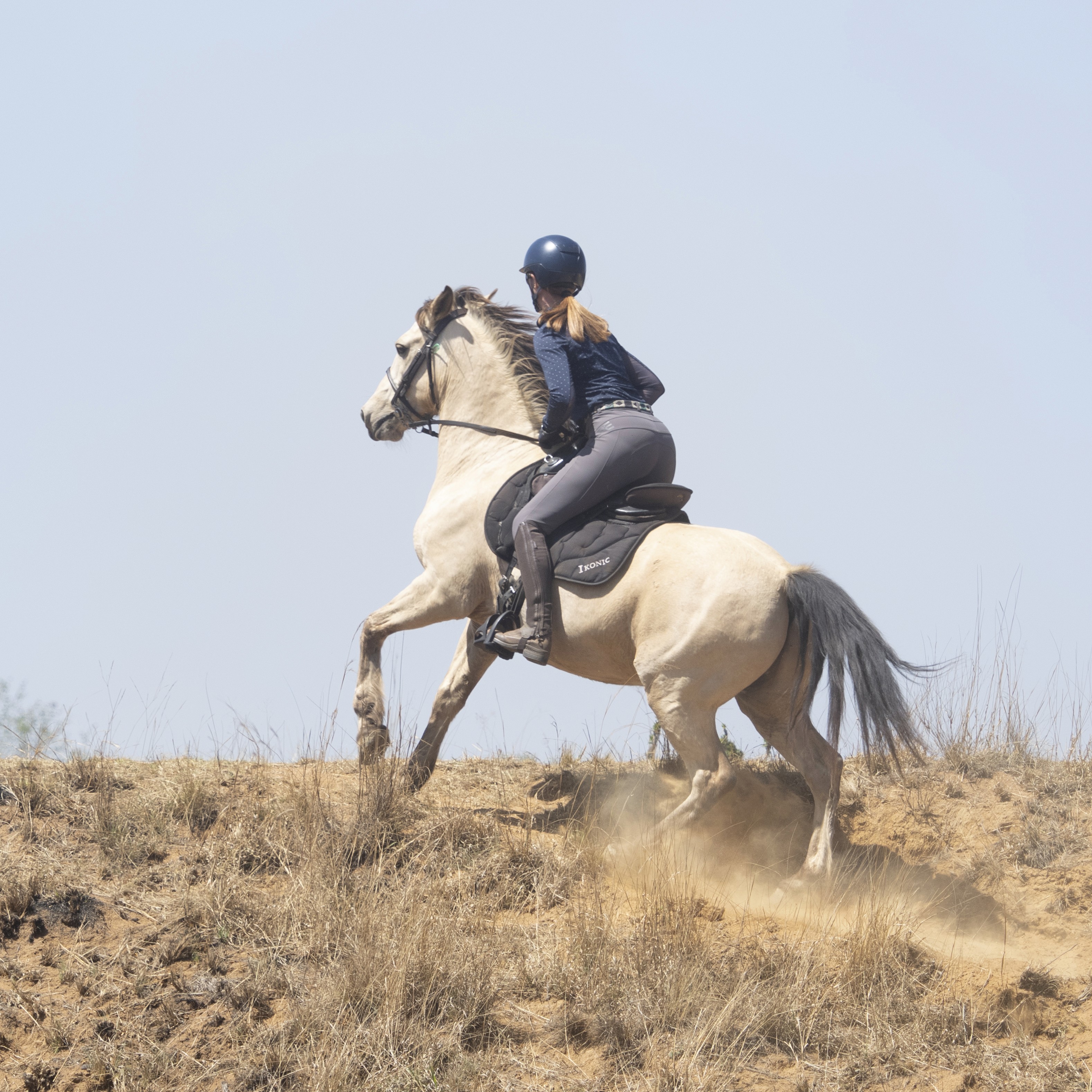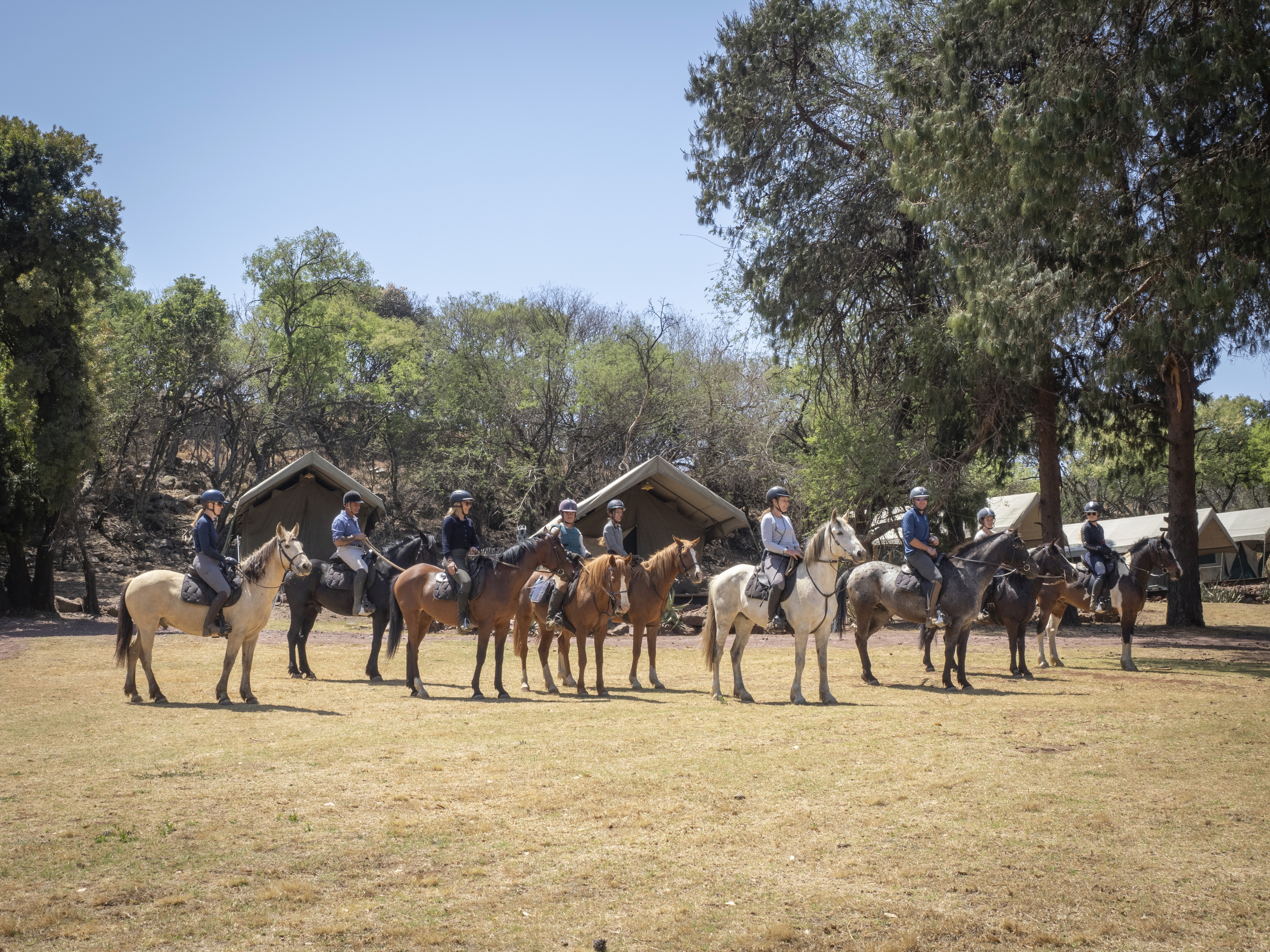 Boendet på Wild Ride är ett litet, personligt tented camp med nio safaritält, placerade mitt i reservatet men med bekvämligheter som gör vardagen enkel efter långa dagar till häst. Tälten ligger cirka 100 meter från de gemensamma ytorna och erbjuder både avskildhet och närhet till campens sociala liv. Campens gemensamma ytor är enkla men genomtänkta: en kallvattenpool, lounge med öppen spis, TV-rum med sällskapsspel och tillgång till vandringsleder i reservatet. Wi-Fi finns i huvudområdet, men inte i tälten – ett medvetet val för att behålla känslan av lugn och närvaro.