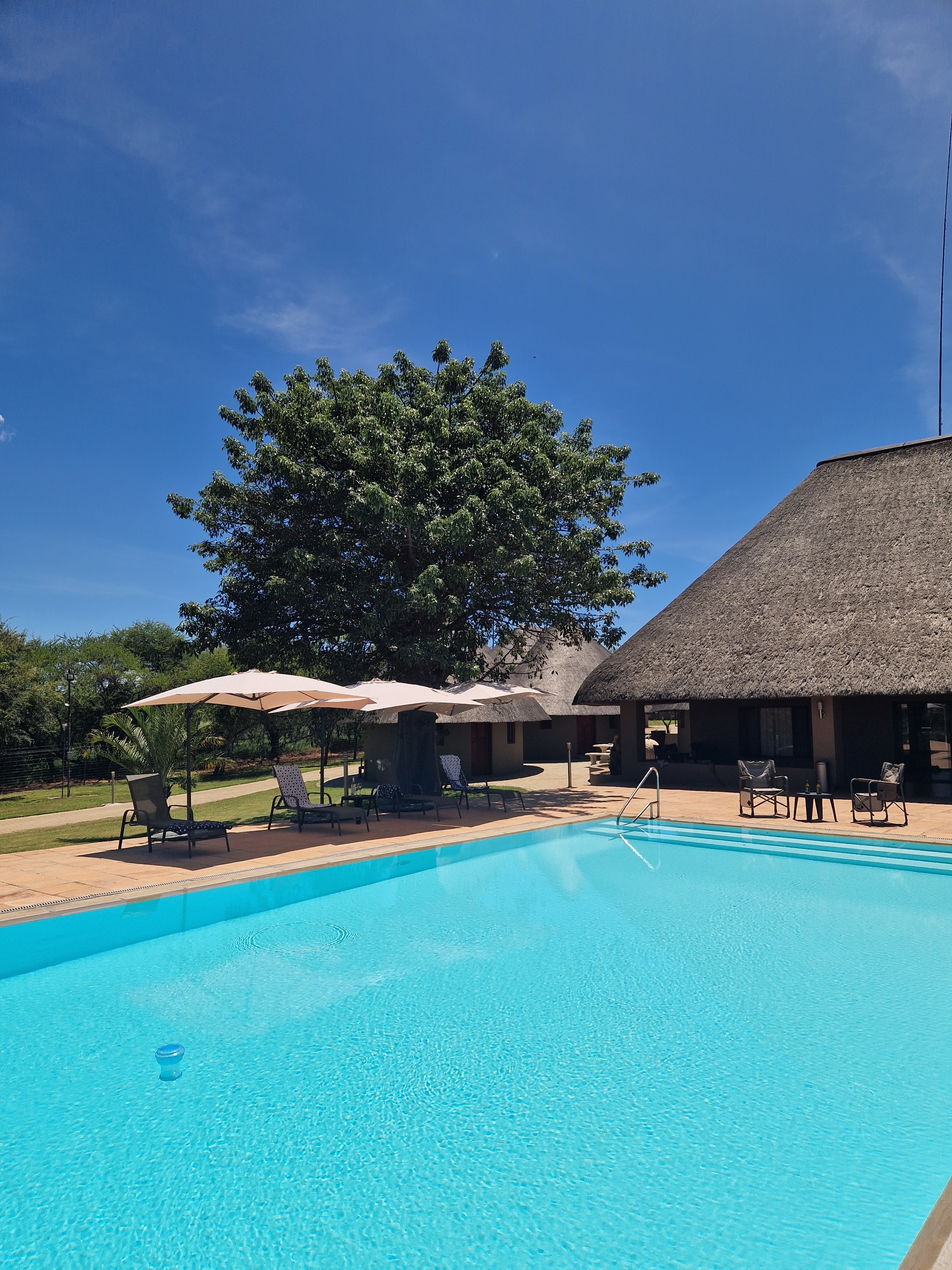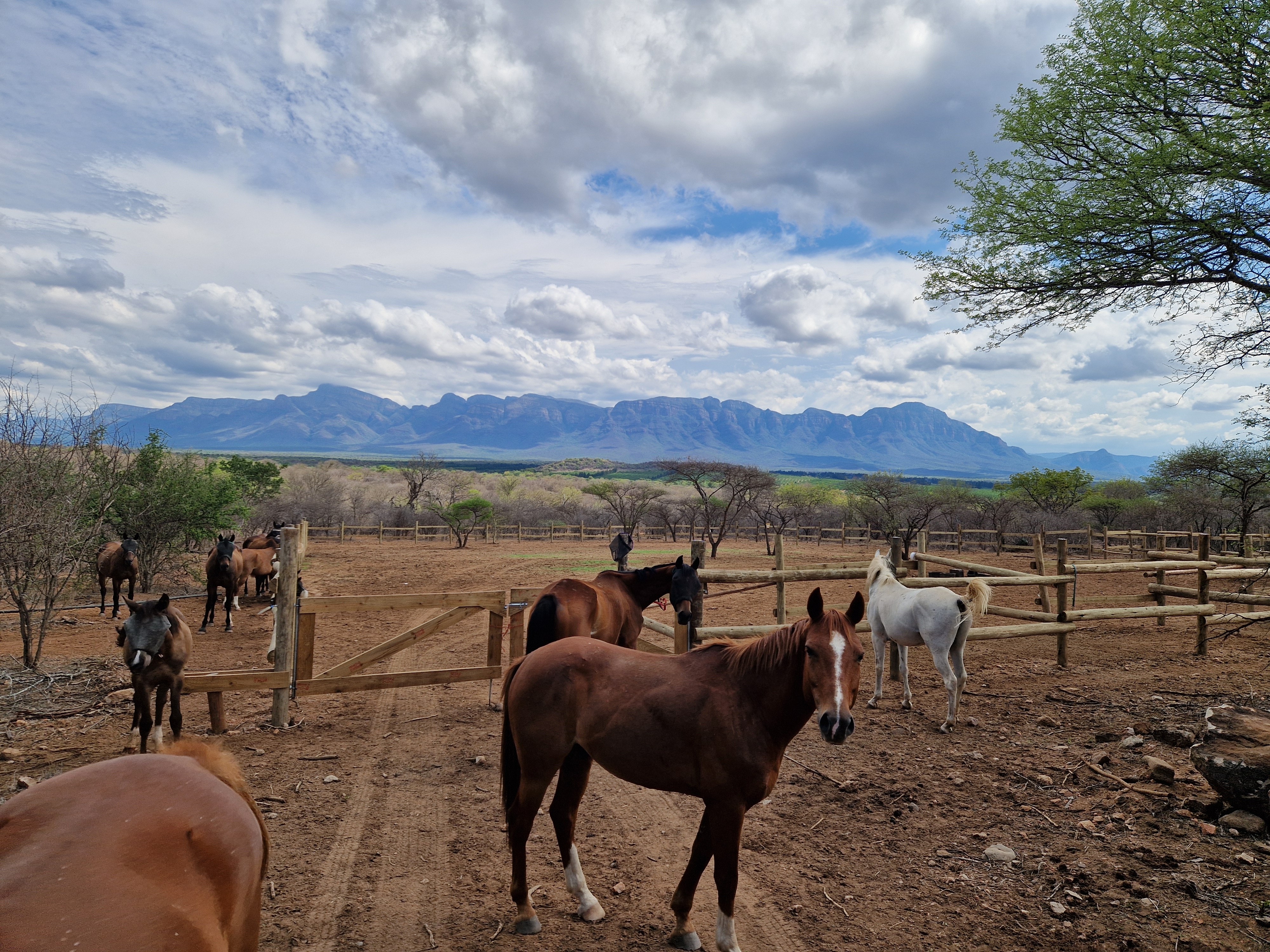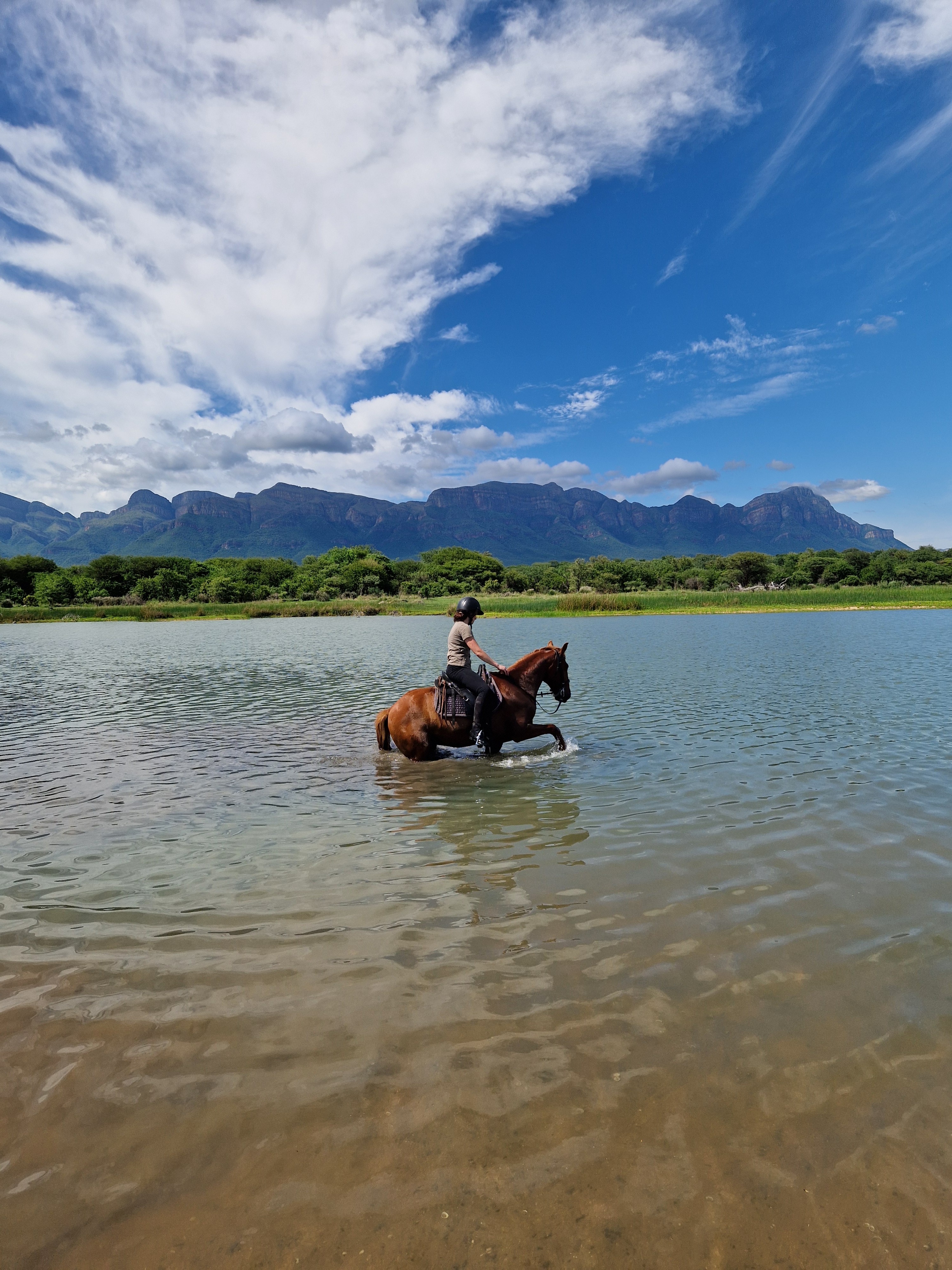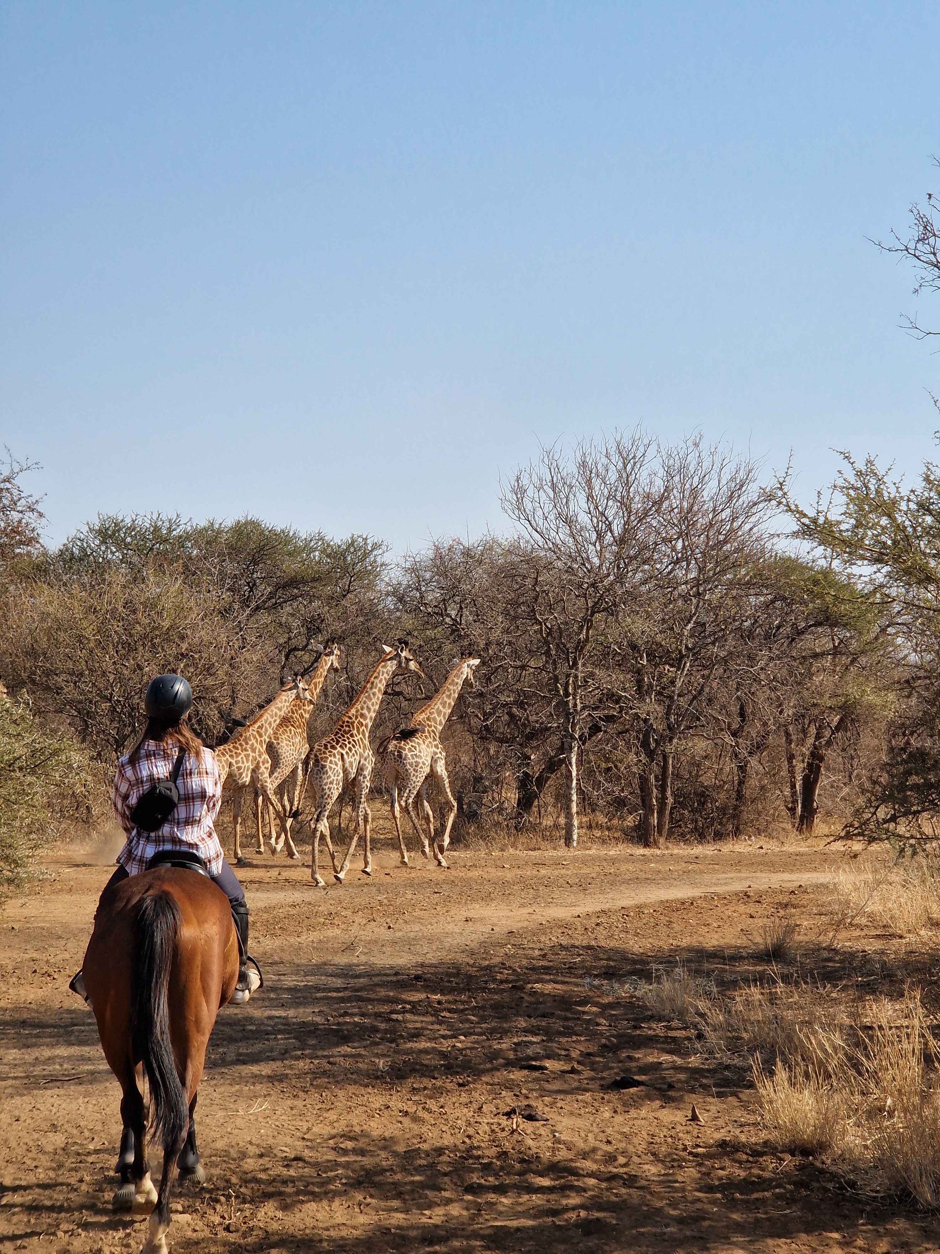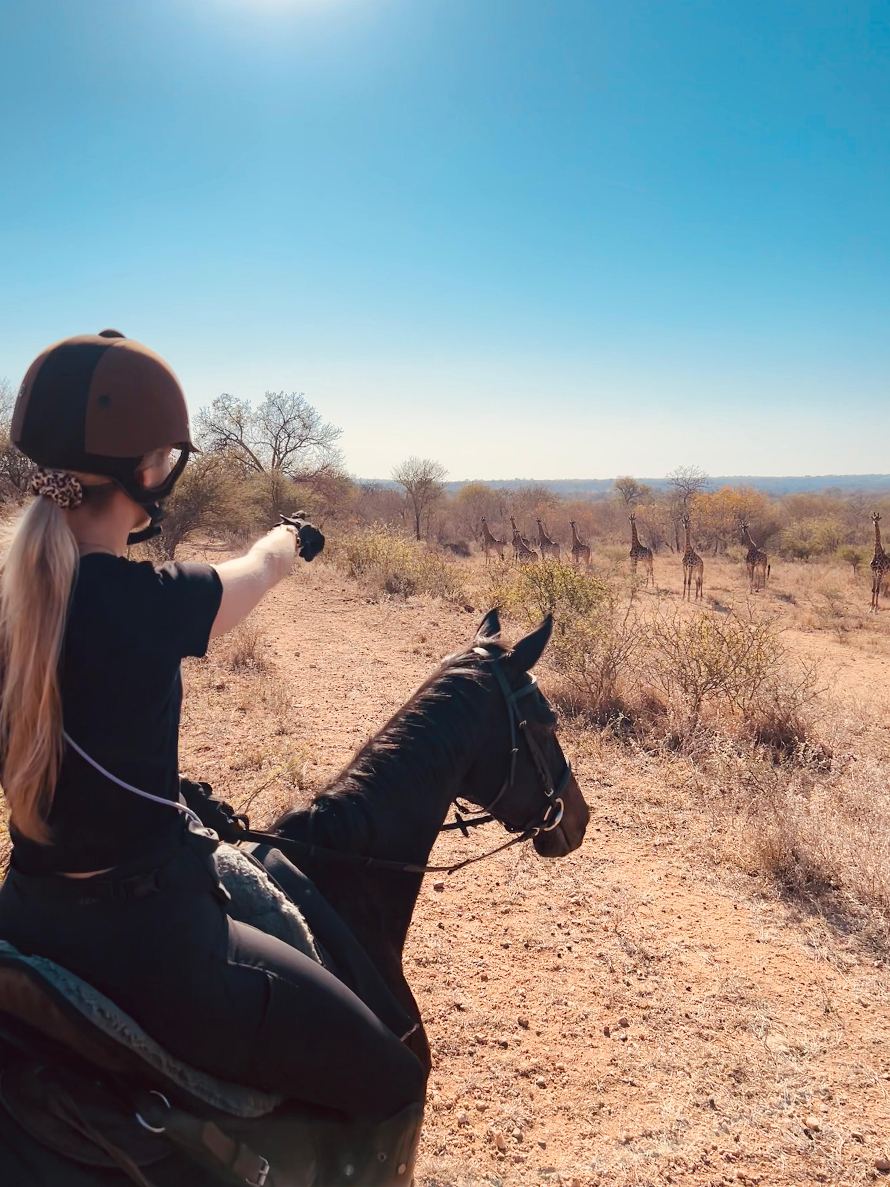 På Bambelela Horse Safaris finns inget fast schema som alltid följs. En vanlig dag börjar med frukost, följt av en längre uteritt på förmiddagen. Efter ridningen finns tid att varva ner, njuta av poolen och äta lunch. Under perioder när vi rider två pass per dag väntar ytterligare en uteritt senare på eftermiddagen. Om värmen eller andra aktiviteter gör att en andra ridtur inte genomförs, ersätts den i stället av en game drive med sundowner. När hästarna är omhändertagna för kvällen samlas ni för middag tillsammans på lodgen och därefter finns tid för avkoppling eller ytterligare en game drive. En typisk dag innehåller utfodring av hästarna – och vintertid även av de vilda djuren – följt av frukost. Hästarna görs sedan i ordning inför förmiddagens uteritt som vanligtvis varar i två till tre timmar. Efter lunch finns fri tid innan hästarna återigen görs i ordning för en kortare uteritt på eftermiddagen, normalt en till två timmar. Dagen avslutas med kvällsfodring, middag och ledig tid. Måndag fungerar som både ankomst- och avresedag, och hästarna har en vilodag per vecka. Ridningen sker i regel på morgonen med längre turer och på eftermiddagen med något kortare pass. Varannan vecka ingår hoppning på ridbanan vid Equine House i Hoedspruit, kombinerat med en uteritt i Zandspruit Bush & Aero Estate. Lika ofta genomförs ett uppskattat upplägg där vi rider ner till Klaserie Dam för att bada med hästarna, övernattar på Sunbirds Oasis Lodge och rider vidare följande morgon till Pezulu Tree House Lodge i Guernsey Private Nature Reserve. Utöver ridningen ingår en game drive med sundowner per vecka (ej Big Five), samt en gemensam middag på restaurang en gång i veckan (på egen bekostnad). Det finns även möjlighet att boka extra utflykter och turer mot tillägg, såsom besök i Kruger National Park, Panorama Route, Blyde Canyon eller olika elefantupplevelser. Observera att ridning och aktiviteter kan komma att justeras beroende på väder eller andra oförutsedda omständigheter. Uteritterna genomförs på flera olika platser i området runt lodgen. På den egna marken finns goda möjligheter att se giraff, zebra, gnu, eland, struts, schakal, nyala, impala, duiker och sabelantilop. De angränsande privata områdena, som sträcker sig över 600–1200 hektar, hyser även kudu, vårtsvin, flodhäst och krokodil samt ett rikt och varierat fågelliv.